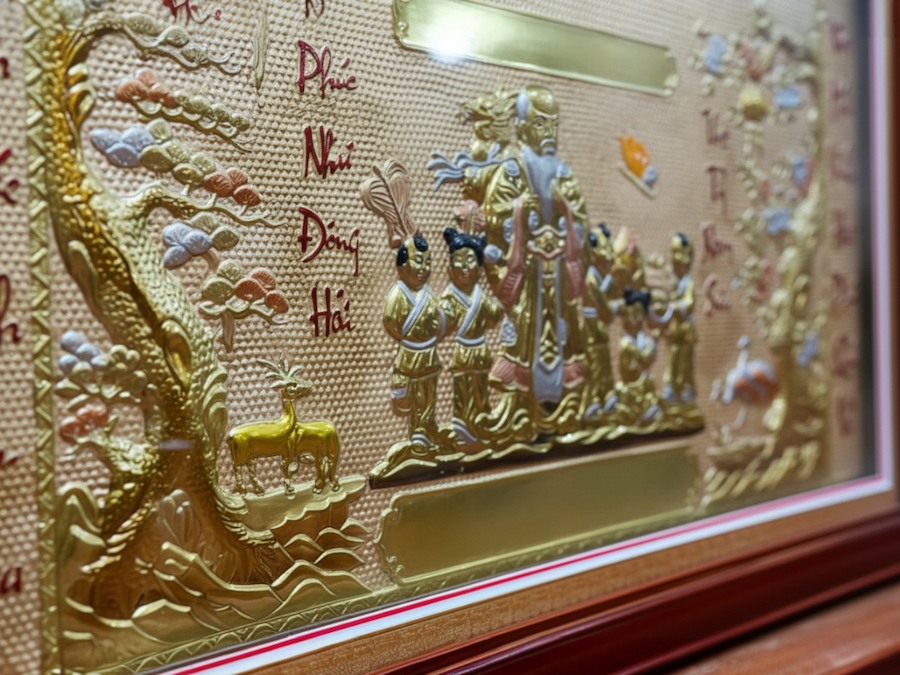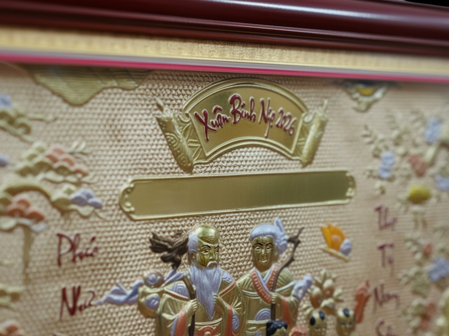 Câu đối này đã trở thành biểu tượng của mọi dịp mừng thọ, thể hiện lời chúc sâu sắc nhất mà con cháu dành cho ông bà, cha mẹ. Trên bức tranh, mỗi chữ được thúc nổi tỉ mỉ, tạo độ nổi rõ nét, vừa mang vẻ đẹp nghệ thuật vừa thể hiện sự trân trọng của người tặng.